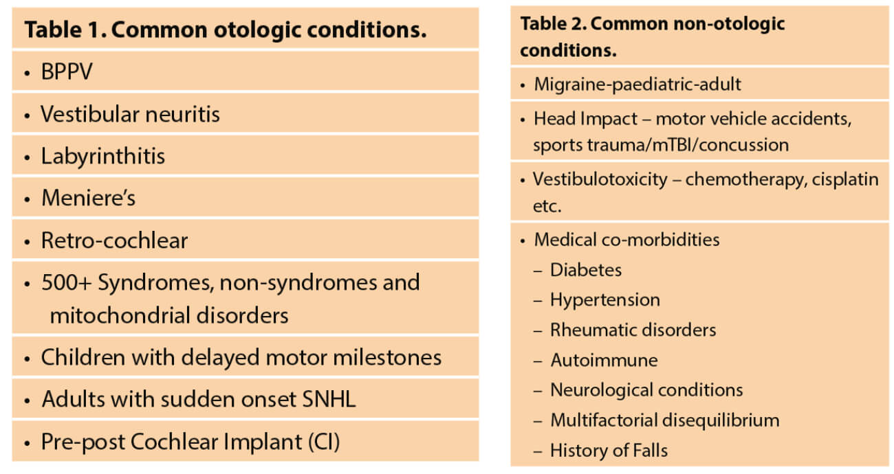 Equilibrium dysfunction is well documented across the lifespan, from congenital to age-onset. The most common otologic conditions and candidates for evaluation are outlined in Table 1. There are also many non-otologic causes of equilibrium related to numerous comorbidities as shown in Table 2. Therefore, it is critically important for all healthcare practitioners focused on the evaluation and management of individuals with equilibrium dysfunction to also be aware that most are not candidates for pharmacological or surgical intervention.