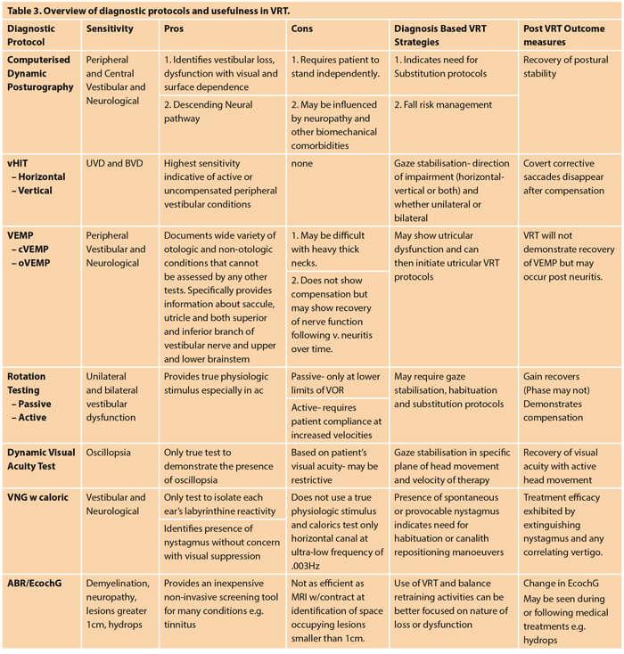 The availability of well-trained professionals and the technology to evaluate patients will determine which clinical pathways and testing protocols are engaged. In locales where minimum technology is available, the use of bedside protocols may be the norm. Many facilities around the world do not have access to VNG, vHIT or rotary chair testing, so more modest protocols, which still retain good sensitivity, should be utilised. Often, even these modest protocols will provide excellent information to assist diagnosticians and rehabilitation specialists in the proper triage and treatment. Both bedside and range of technologies and their respective pros and cons are shown in Table 3.