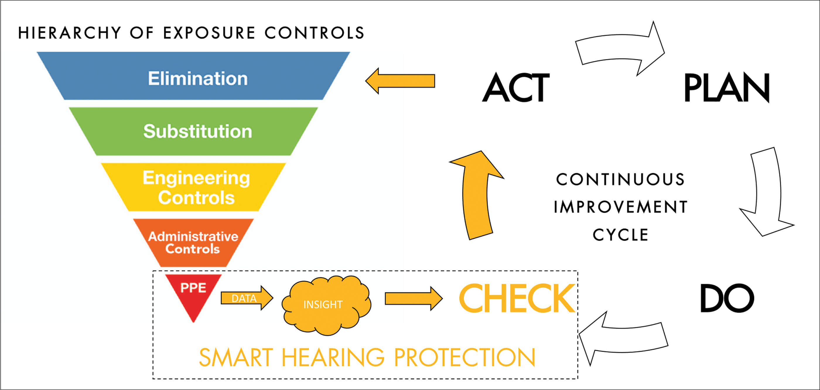 Smart hearing protection, however, utilises integrated microphones and data transfer to monitor and provide alerts related to wear rates and noise exposure. By utilising this type of insight from smart hearing protection, a hearing health professional or other duty holder can take action years before permanent harm is caused. This may involve educating and informing a person about their known sound exposures and taking steps to prevent exposures from occurring. The insights from smart hearing protection can provide the missing link between applying a process of continuous improvement with the hierarchy of risk controls (Figure 1).