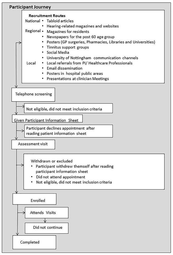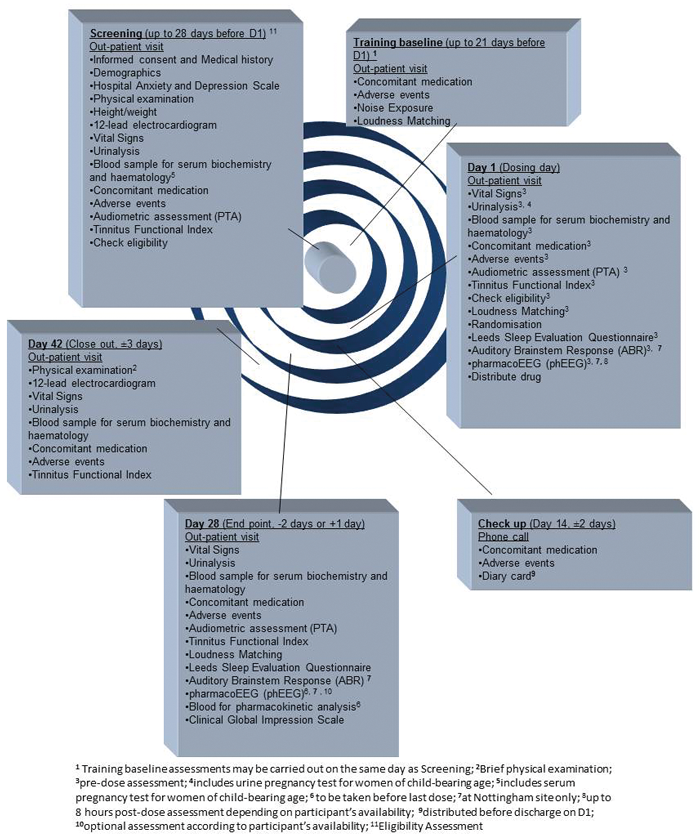 No less than 25 people from seven departments were on the site delegation log (including two investigators from ENT, audiologists, nurses and pharmacists). The Nottingham site was the only one to perform phEEG and ABR tests (Figure 1).