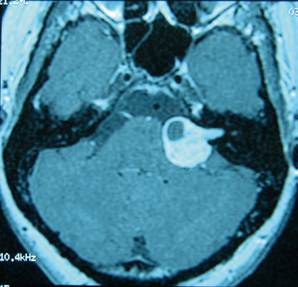 Figure 2: Gadolinium enhanced MRI scan showing a left vestibular schwannoma.