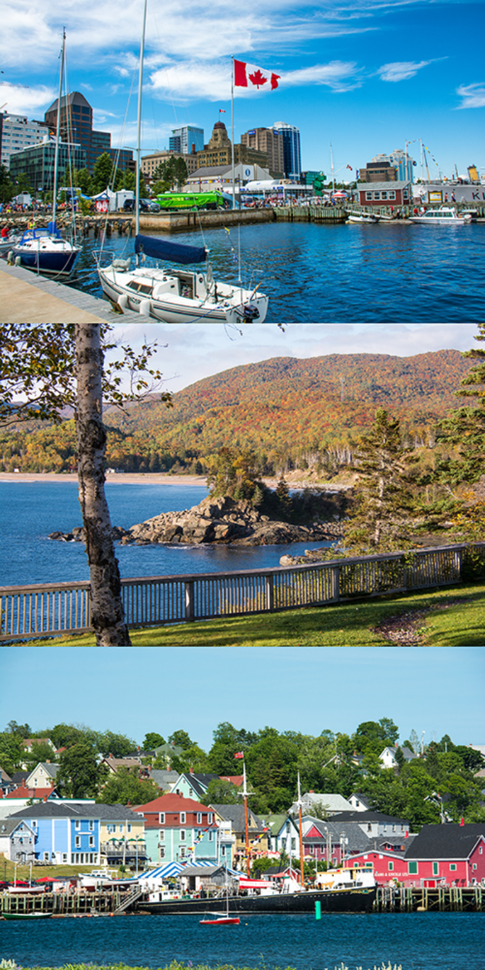 Figure 1: (Top to bottom) A view of Halifax from the waterfront boardwalk; Ingonish beach on Cape Breton Island;