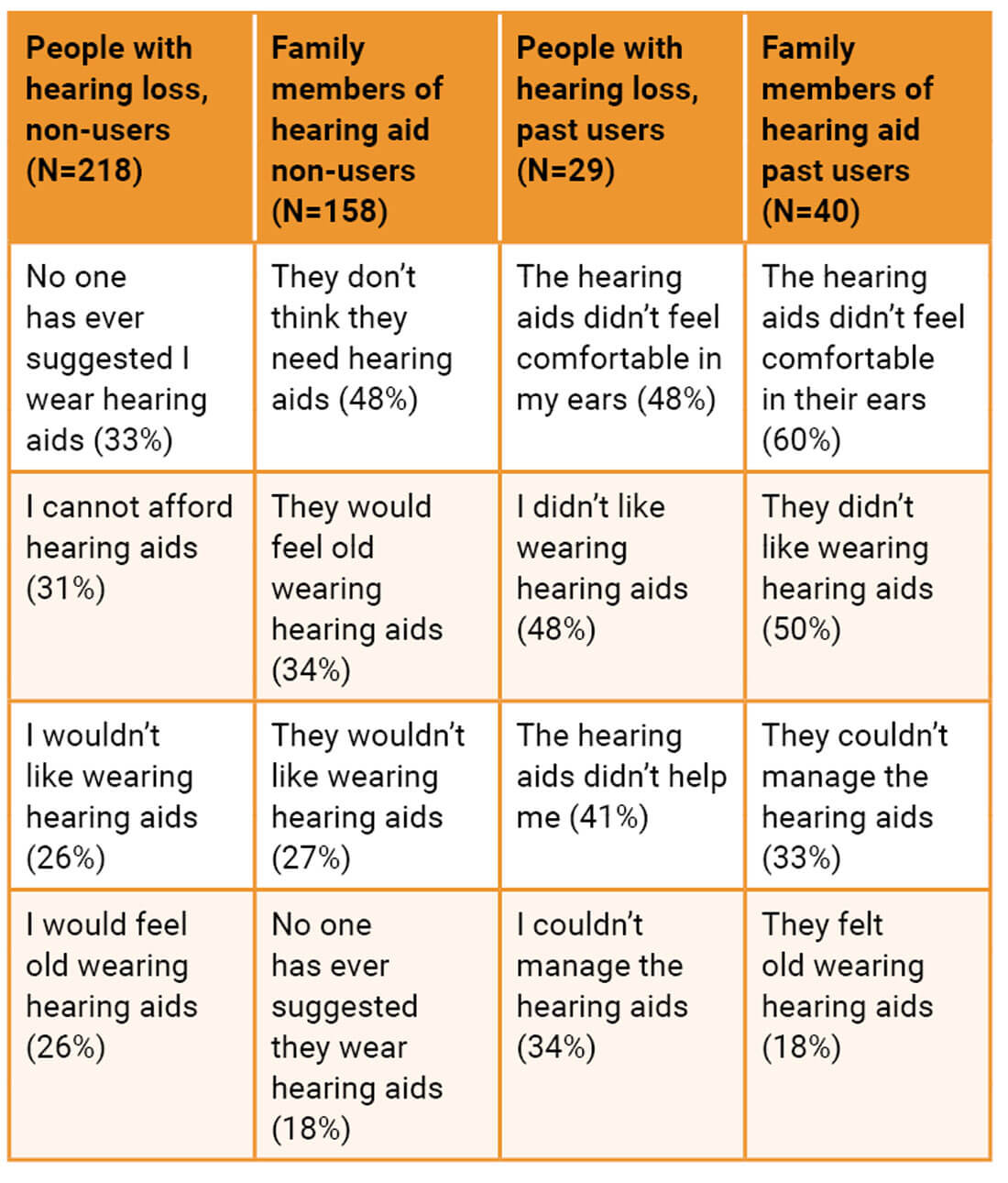 The table below shows the most common reasons given for the non-use of hearing aids. Multiple response options were possible.