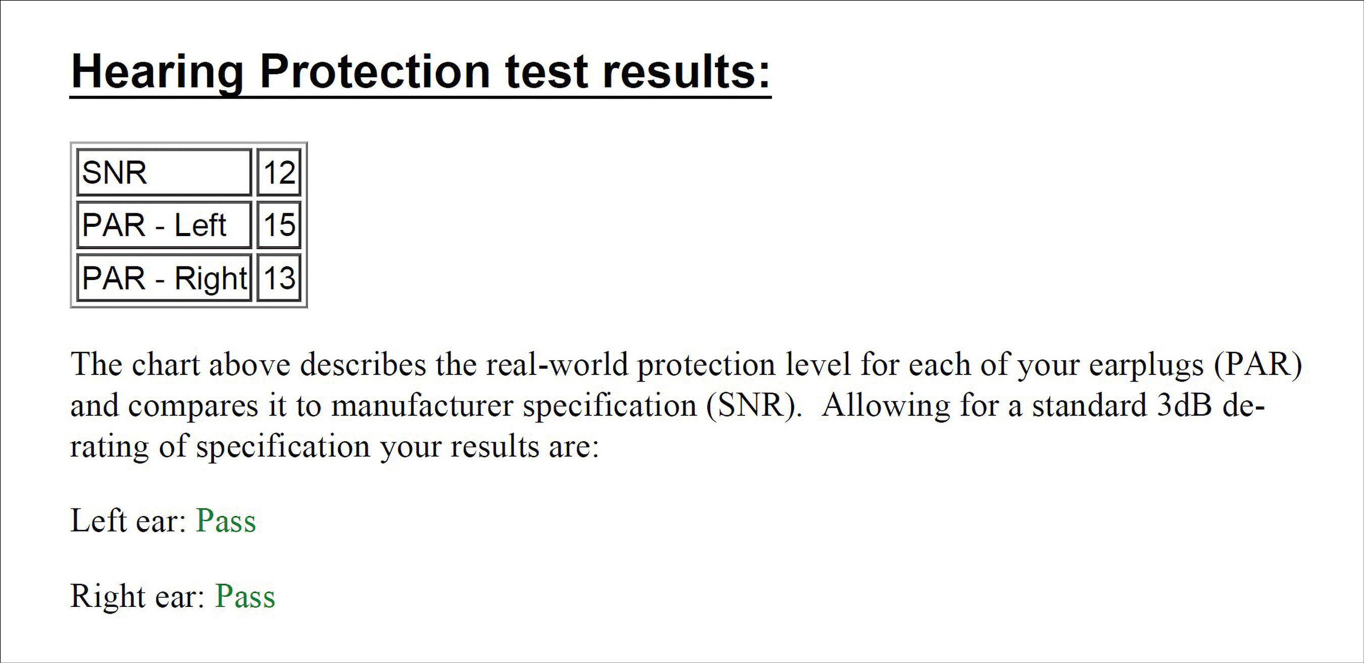 Next, the consumer is asked to insert the earplugs under the headphones and perform the test again. At the end, a report is produced that outlines the protection level of each plug. This generates a pass/fail grade by comparing the expected specifications with the real-world fit. The report also comes with some useful information which can be accessed any time the consumer logs in to their account.