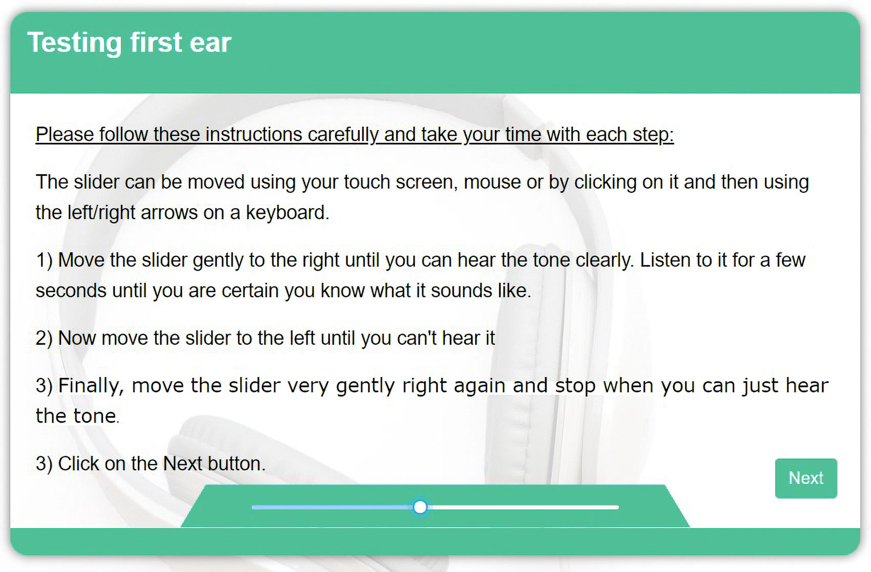 The test consists of a few questions at the beginning, including the signal-to-noise (SNR) ratio of the earplugs, and then the consumer calibrates their headphones to their computer to ensure that they are at the proper loudness for testing. Once the set-up is complete, the consumer listens to one pure tone in the first ear and, using a slider, moves the slider so that the pure tone is just audible. This continues until the consumer has completed six different pure tones per ear.