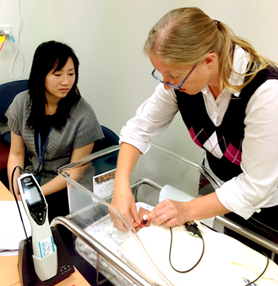 Figure 3. Audiology students completing wideband absorbance measures on a neonate in a hospital setting.