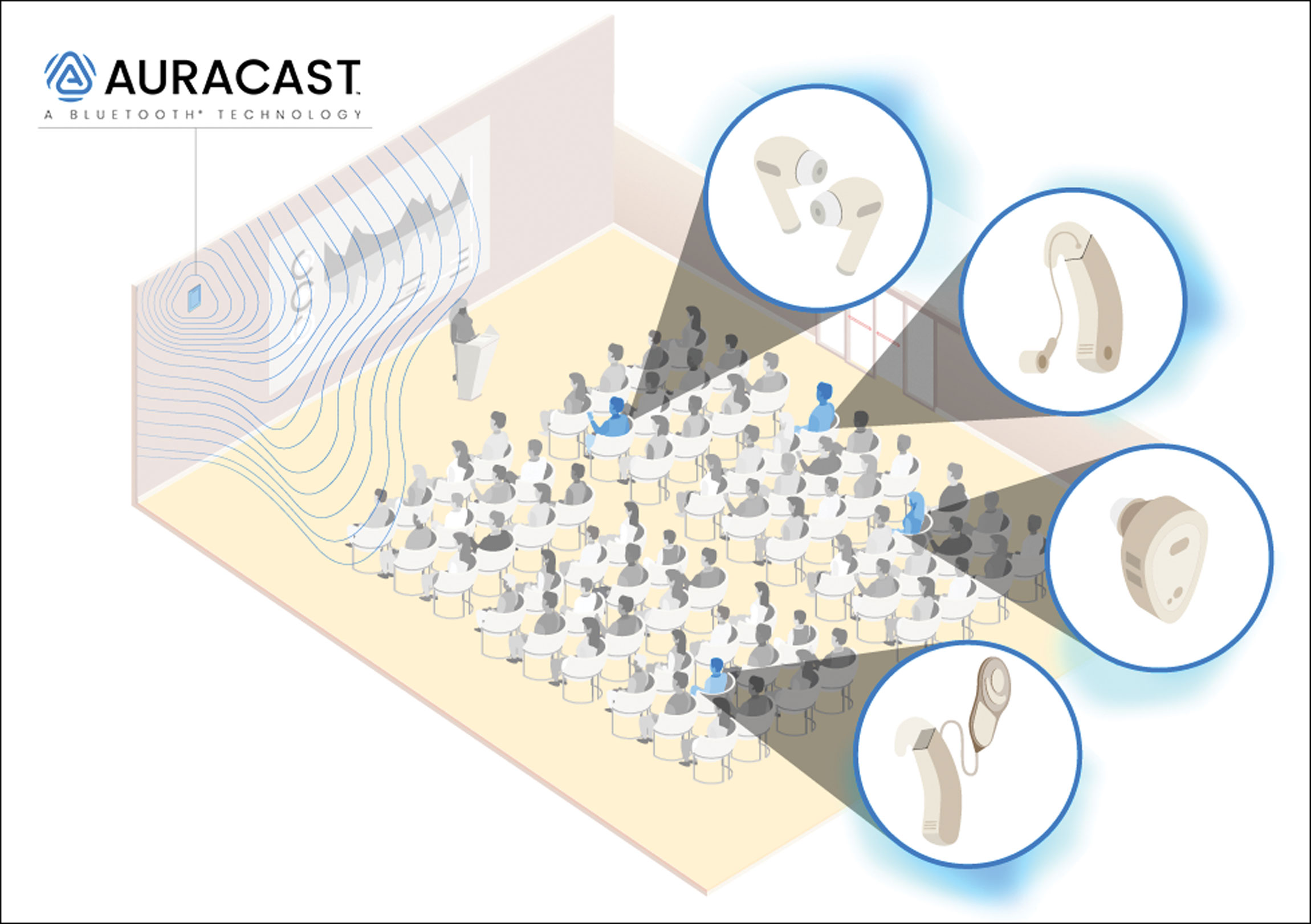 Auracast is the newest solution from Bluetooth Technology to help overcome these challenges. Auracast is an assistive listening system that provides direct audio to people with hearing aids and cochlear implants, and even those wearing earbuds.