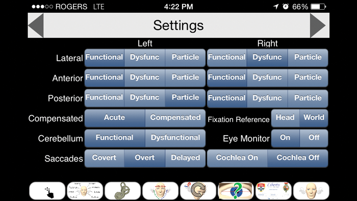 What makes aVOR stand out as an interactive educational tool is that it allows users to explore the pathophysiology associated with the angular vestibulo-ocular reflex. Users of the app can choose to view saccadic eye movements resulting from various vestibular pathologies (e.g. impaired VOR, canalithiasis). For example, a user might select a dysfunction of the left lateral semicircular canal that is acute in nature. Other variables include cerebellar function and the type of corrective saccade(s).