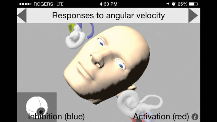 aVOR has a number of features that users can pursue to expand their knowledge. On one screen, labelled models of the semicircular canals provide a useful anatomical overview; as the semicircular canals are rotated in the three Cartesian planes, the appropriate canals light up to show excitation (red) and inhibition (blue). On other screens users can view various animations, including the responses from the different canals to changes in angular velocity.