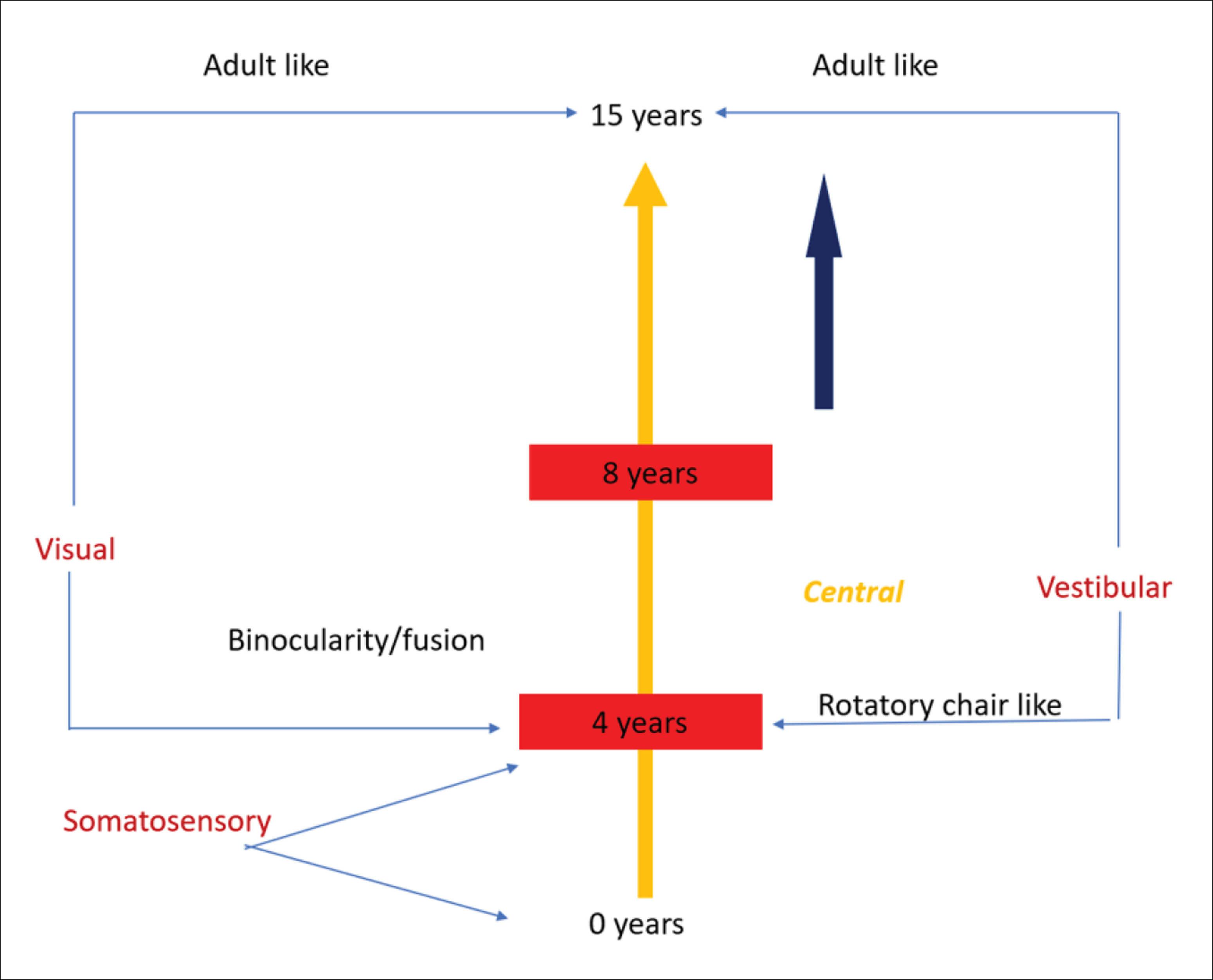The vestibular system in children is just not limited to a vestibular sensation; it also maintains posture and muscle tone, produces kinetic contractions to generate ocular stability and is involved in cognitive and spatial discrimination [4].