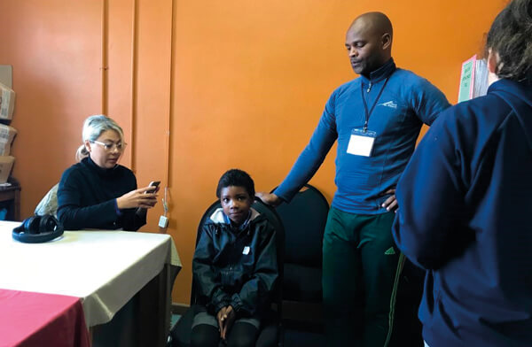 Screening requires flexibility and adaptability to new environments. Jessica McGuire, ENT Surgeon (University of Cape Town, Red Cross War Memorial Children’s Hospital) and Doug Hildrew, Neurotologist (Yale University), conduct onsite assessment of children undergoing hearing screening. Photo courtesy of J Zachary Porterfield.