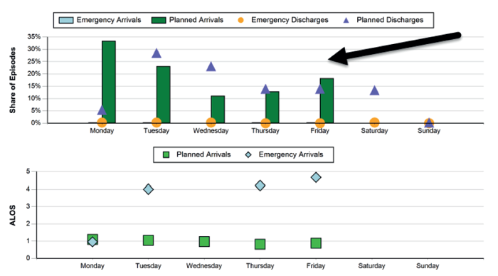 Upon closer examination of the data (Figure 2) it can be seen that, for this organisation, there is a disparity between the numbers of planned arrivals by day of the week. This in turn causes a significant difference between the length of stay of a patient between the busy days of the week and the less busy days. Comparison of this data with similar organisations, followed by a phone call to establish alternative practices that could be employed may help this organisation to deliver a more efficient service.
