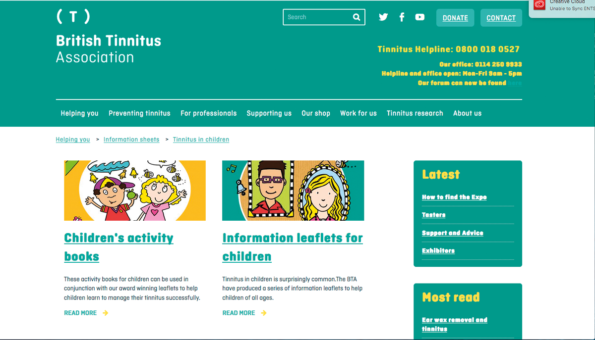 The ‘Helping You’ tab on the BTA website contains information aimed at patient education. This is an excellent place to look for basic tinnitus information that can be easily printed and distributed to patients. The ‘Helping You’ drop-down menu contains an option for information sheets, where you can read or download information on subjects including ‘tinnitus’, ‘self-help’ and ‘supporting someone’.