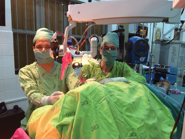 CSC’s director, Jim Gollogly, welcomed me to Phnom Penh and provided invaluable support both clinically and socially. Since our preliminary visit in 2014, Jim had sourced two operating microscopes with a linked flat screen for teaching. Micro-instrument sets were created from donated used equipment; head rings and two Visao drills were kindly donated by AneticAid and Medtronic respectively.