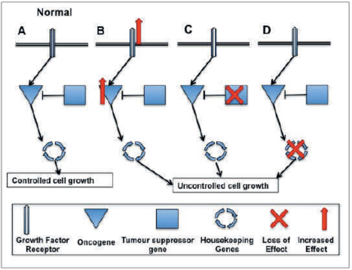 A: Under normal conditions there is a balance between proteins that promote cell growth and proliferation when stimulated by growth factors or high energy levels (proto-oncogenes), and those that prevent it (suppressors). Multiple mechanisms are in place to ensure that the receptors and proto-oncogenic signalling pathways are switched off again once the cell has responded to the initiating signal. Downstream from this point there are a series of ‘checking mechanisms’ designed to ensure that any mistakes made during replication of genetic material are either corrected, or if too damaged, the cell apoptoses and dies.