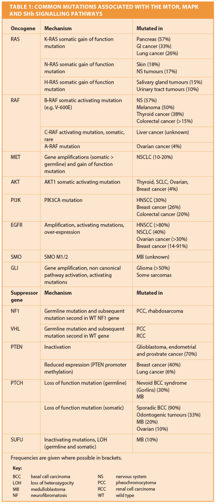 Dysfunction of aspects of the mTOR pathway have been demonstrated for many different tumours including breast, liver, ovarian, melanoma, renal cell carcinoma, haematological malignancies, and neuroendocrine tumours including MEN. Oncogenes PI3K, AKT and Rheb are commonly either mutated or highly expressed in a number of tumours, with resultant downstream pathway activation [6]. PTEN, TSC1 and TCS2 function as tumour suppressor genes, and loss of function mutations in these genes is a frequent observation in many tumours, including HNSCC [4]. Mutations are also common in the MAP kinase signalling pathway, where a number of enzymes have been shown to function as oncogenes (Table 1). Overexpression of EGFR is seen in many tumours, including HNSCC, where over 80% demonstrate abnormal levels [7] and the same is true for VEGFR.