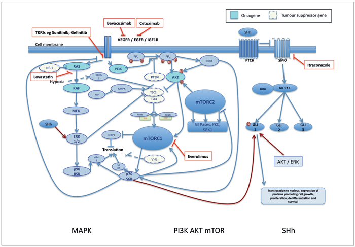 In keeping with findings on other tumours, IHC studies confirmed high levels of the tyrosine kinase receptors VEGFR, IGF1R, and neurotrophin receptors in ONB compared to normal nasal mucosa. High levels of PDGFR is demonstrable in endothelial and other surrounding cells in metastatic disease [18]. These TKRs receptors all activate the mTOR and MAPK signalling pathways. Subsequent studies revealed high levels of proteins linked to hypoxia (HIF1, anti-apoptosis (BCL-2) oncogenic transformation (c-MYC) and developmental pathways (SHh). These proteins are known to cross react - for example, HIF1, once activated increases transcription of BCL-2 and VEGFR, which leads to further increase in HIF1 expression in a feedback loop involving the mTOR pathways. Both the MAP kinase cascade and the SHh pathway cause increased c-MYC expression, which triggers similar feedback loops to both pathways, ultimately promoting angiogenesis (VEGFR) and inhibiting apoptosis (BCL2).