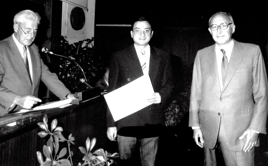 On 31 October, 1990, during the ceremony for awarding the ‘Resident Étranger des Hôpitaux de Paris’ certificates at the Collège de Médecine. (L-R): Mr François Stasse, Director General of Assistance Publique, Hôpitaux de Paris; Prof Mohamed Badr; and Prof Sterkers, Chairman of the ENT Department at Hôpital Cochin.