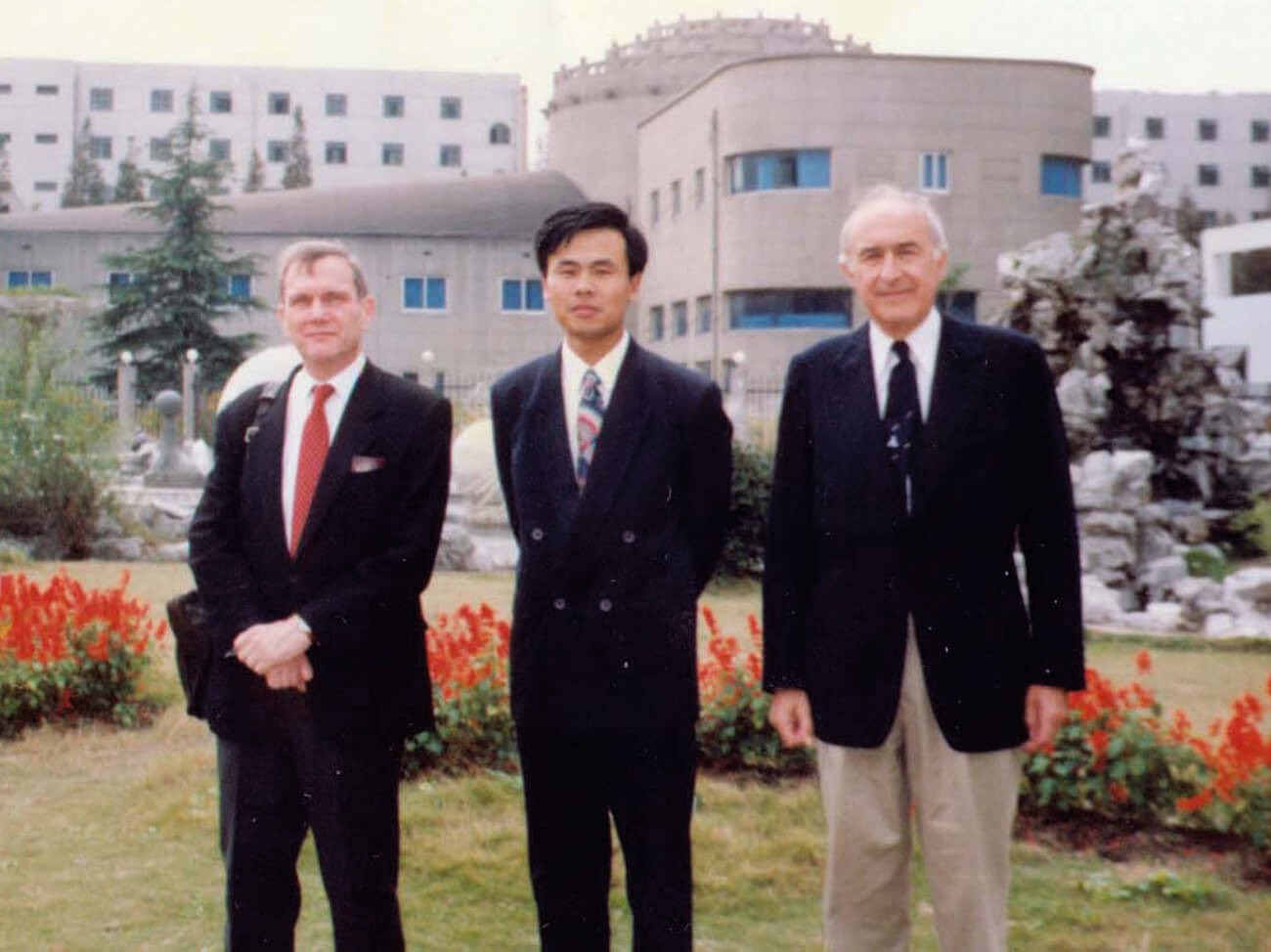 Prof Sterkers (right) and Prof Alain Rey (left) first visited Shanghai in November 3, 1995, received by Prof Wu (centre).