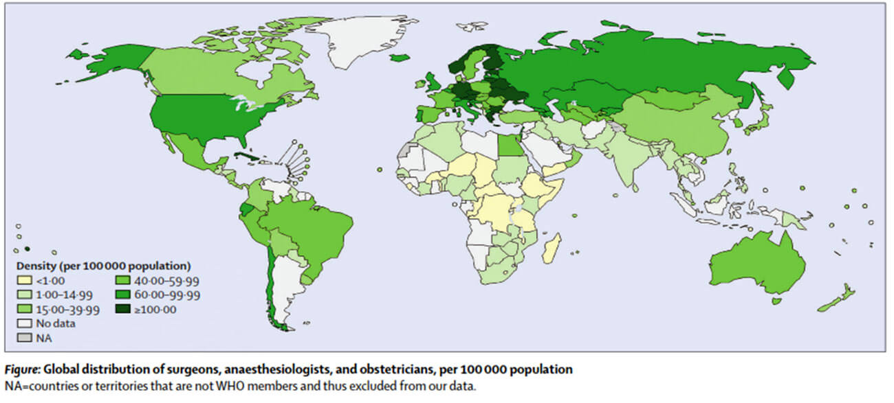 2. Holmer H, Lantz A, Kunjumen T, et al. Global distribution of surgeons anaesthesiologists and obstetricians. The Lancet Global Health 2015;27(3):s9-11