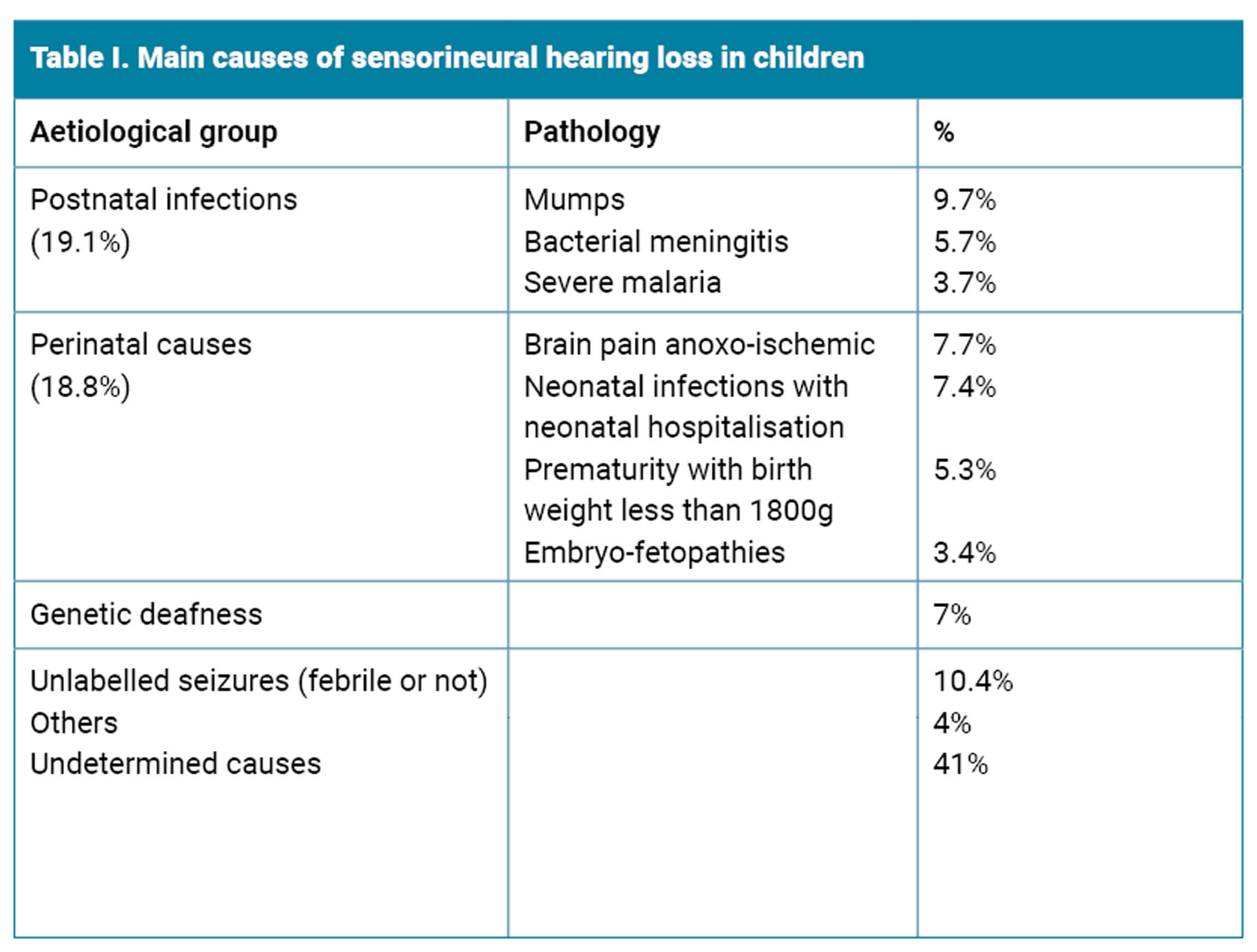 According to hospital studies carried out in Côte d’Ivoire, sensorineural hearing loss is predominant: two out of three (60 -75%) cases of deafness in children are sensorineural [7,8]. The main aetiologies of these cases are summarised in Table I.