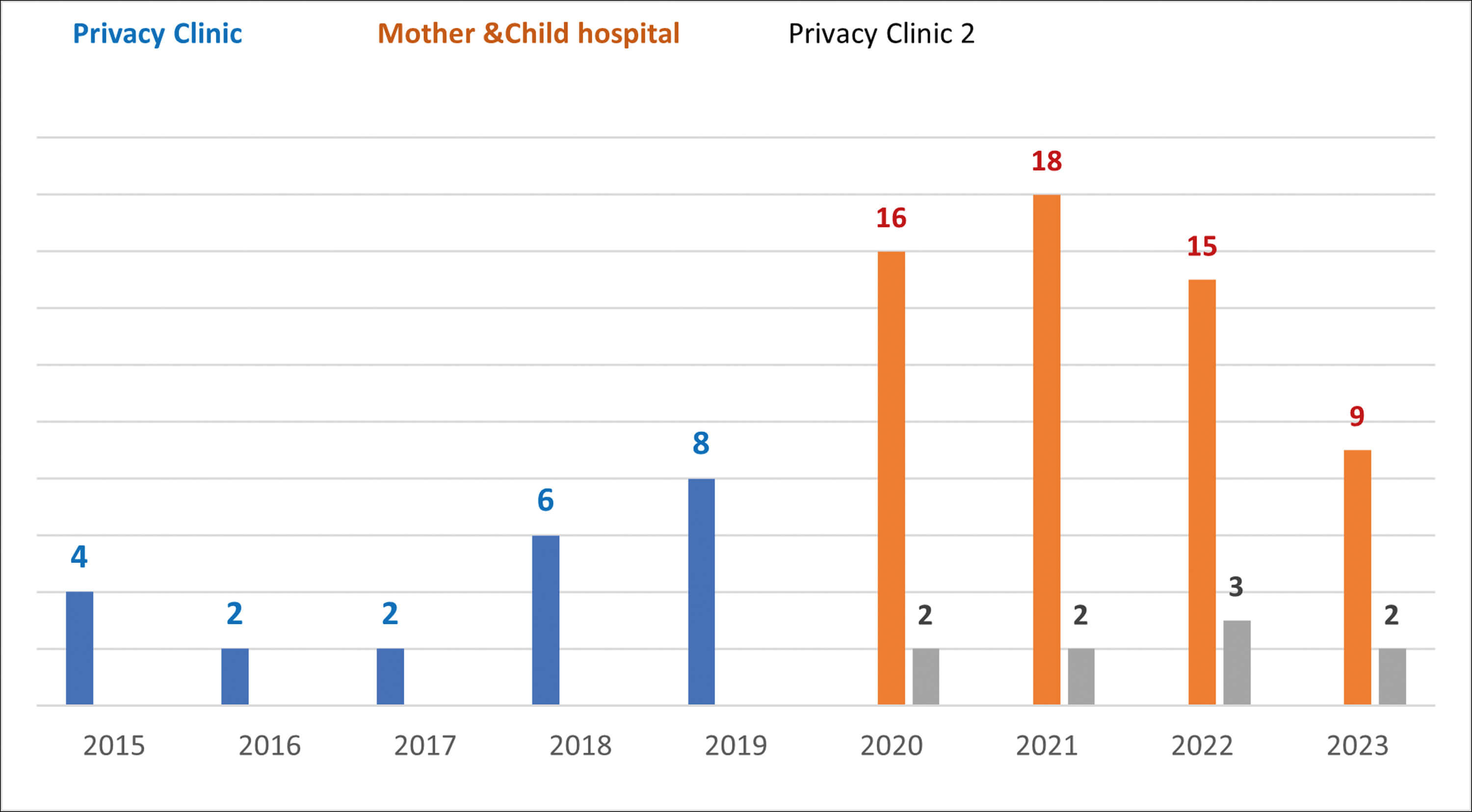 Figure 1. Distribution of patients by year and type of structure (from December 2015 to April 2023).