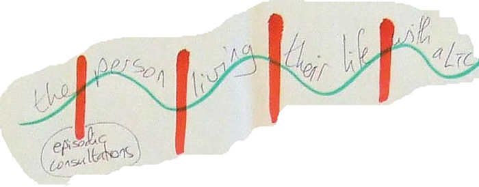 Figure 1. Representation of living with a long-term condition, drawn on a paper tablecloth by a person with a long-term condition (reproduced with kind permission of Year of Care Partnerships, http://www.yearofcare.co.uk/).