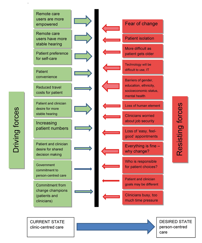 Figure 2. Driving and resisting forces to consider when making a change to person-centred care. Some potential benefits of person-centred cochlear implant care.