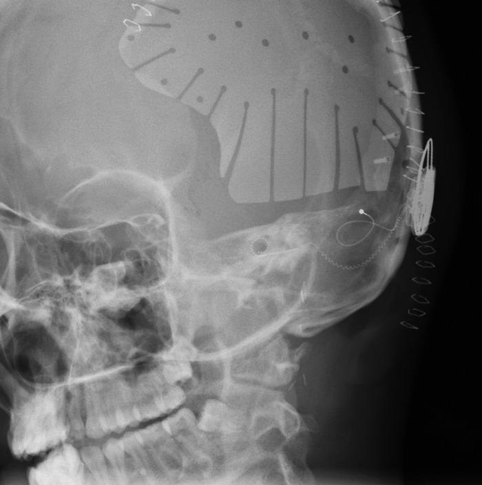 Figure I. Postoperative plain X-ray of a case of SSD secondary to trauma. Hearing in the left ear was lost as a result of a gunshot injury, contralateral hearing was normal. The patient underwent emergency decompressive craniectomy and then three months later simultaneous cranioplasy and cochlear implantation. The image shows a full insertion of the electrode and the CI body placed low, below the cranioplasty plate.