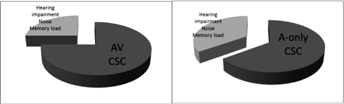 Figure 1. Seeing the talker’s face (AV CSC) enhances performance when speech is heard in noise, under cognitive load and with hearing impairment, compared to simply listening to the auditory signal (A-only CSC).