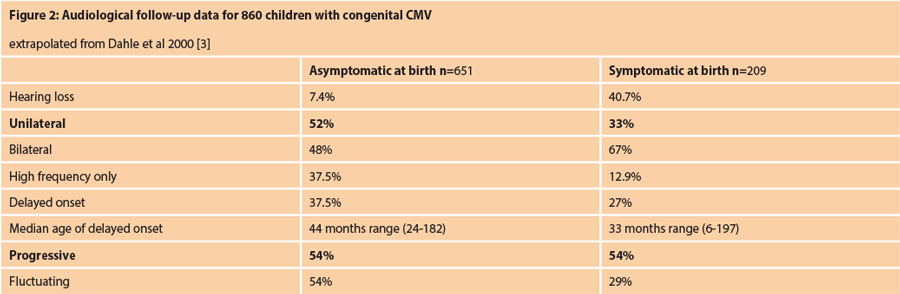 cCMV causes 10-20% of childhood SNHL. It has no characteristic audiometric pattern. It may begin as a unilateral loss, but subsequently affect the other ear, so it is important to investigate unilateral SNHL for cCMV. The hearing loss is progressive in 50% of cases, (see Figure 2), and bilateral severe-profound SNHL requiring cochlear implantation is not uncommon.