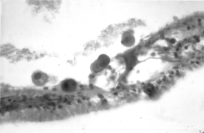 Figure 3: Large CMV infected cells in the organ of Corti courtesy of Professor Leslie Michaels.