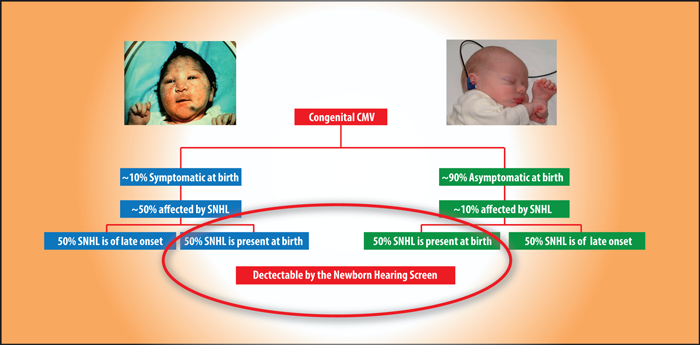 Approximately 90% of children are born without obvious symptoms and signs, called the ‘asymptomatic at birth’ group. The majority will not develop adverse effects of cCMV, but 10-15% of the ‘asymptomatic at birth’ group, will be affected by SNHL. Overall, two thirds of children with cCMV-related SNHL are well children, from this ‘asymptomatic at birth’ group.