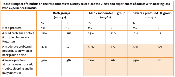 Working with The Ear Foundation, we devised a study to explore the views and experiences of adults with hearing loss who experience tinnitus via an online questionnaire and interviews. The questionnaire was disseminated through the databases and social media of the British Tinnitus Association (BTA), The Ear Foundation Research Forum, deafPLUS and The Tinnitus Clinic Ltd (London). We had responses from 1432 adults. Of these, 1002 reported having a mild / moderate hearing loss and 286 a severe / profound hearing loss and it is the responses from those with hearing loss we will explore in this article.