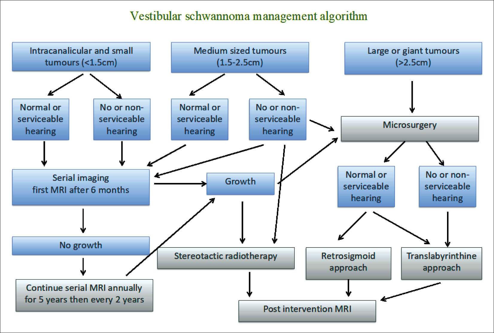 Figure 1 is the author’s broad algorithm for managing the patient presenting with a diagnosis of vestibular schwannoma. The tumour size refers to the maximum diameter in the cerebellopontine angle (CPA) thereby excluding the component in the internal meatus.