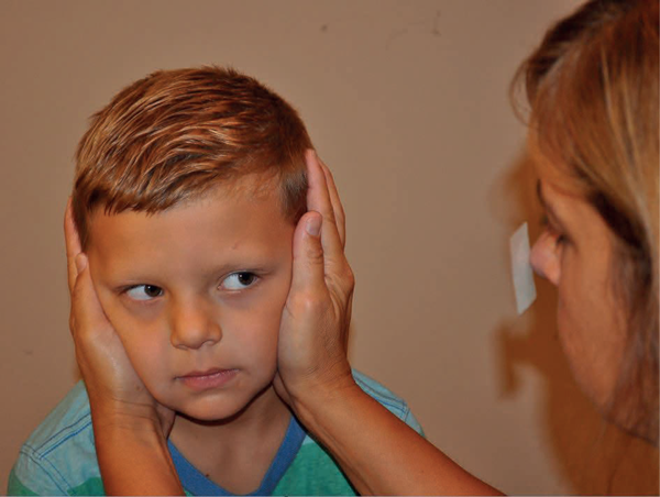 Figure 5 (right): Head impulse test. The child is asked to stare at the sticker on the examiner’s nose while the examiner quickly moves their head to the right and then to the left. The examiner is looking for the child’s ability to maintain gaze on the sticker while the head is in motion. If the eyes move with the head and have to make a jump back to the sticker, this may indicate a peripheral vestibular weakness on the side to which the head was moved.