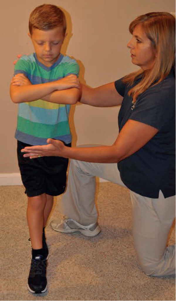 Figure 4 (left): Tandem Romberg. The child is asked to put one foot in front of the other, arms folded, then close eyes. The child should be able to maintain balance for 10 seconds. A fall to one side may indicate vestibular dysfunction. Note: The clinician is protecting the patient in the event of a fall.