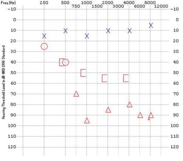 - Right ear: Mild sloping to profound mixed hearing loss