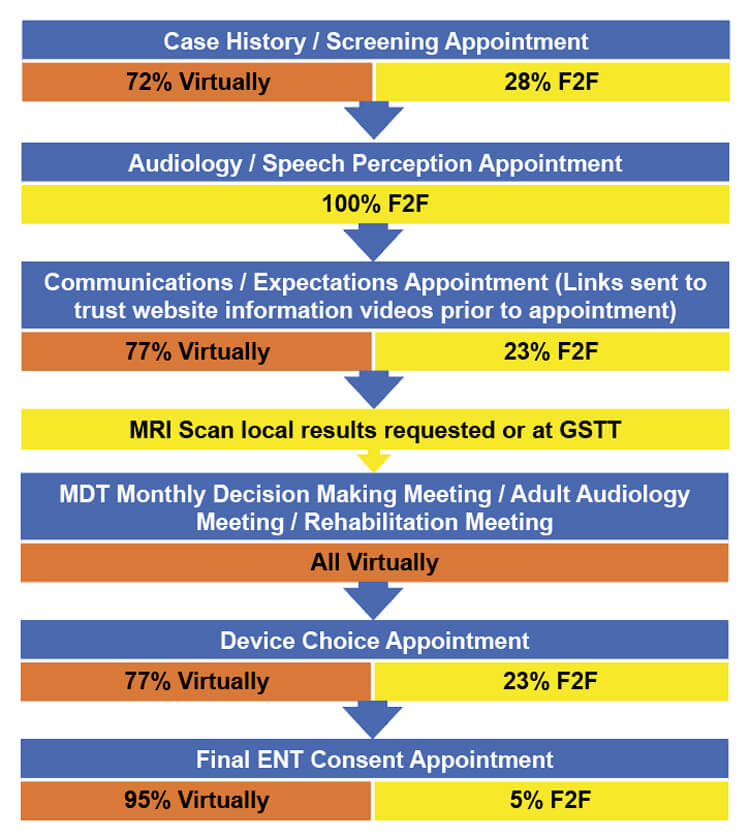 As Guy’s and St Thomas’ was a front line COVID-19 hospital, the Hearing Implant Centre needed to move any routine care to remote appointments and only offer face-to-face (F2F) appointments where remote care is not possible.