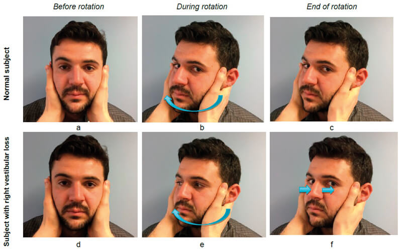 Figure 1. The clinical head impulse test (cHIT). The pictures show a right head impulse on a normal