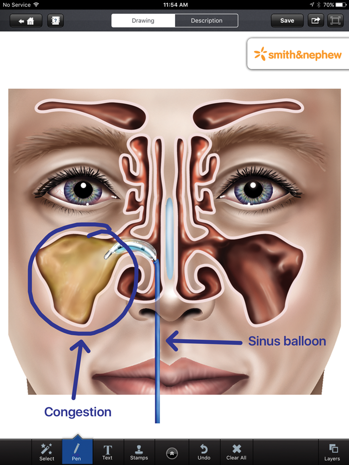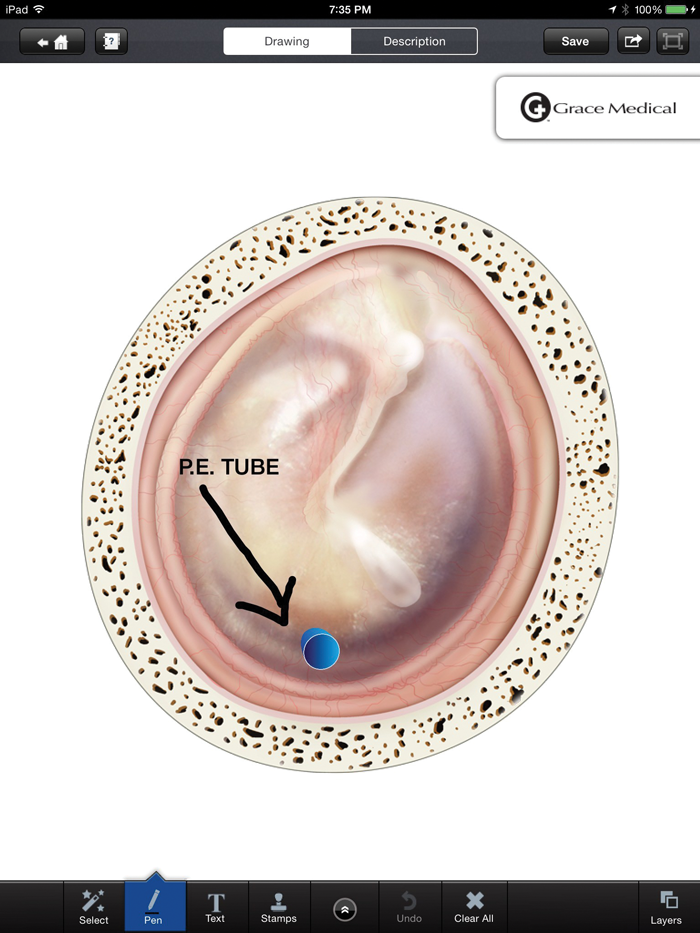 The tool that really makes DrawMD ENT stand out from other apps is called the stamp tool. The stamps are essentially overlay images that can be selected to illustrate various pathologies within ENT, as well as treatments (e.g. PE tubes, septal deviations).
