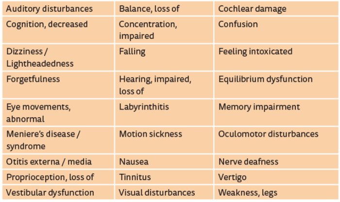 Table 1 is a partial list of reported side-effects that could affect audiometric / vestibular testing.