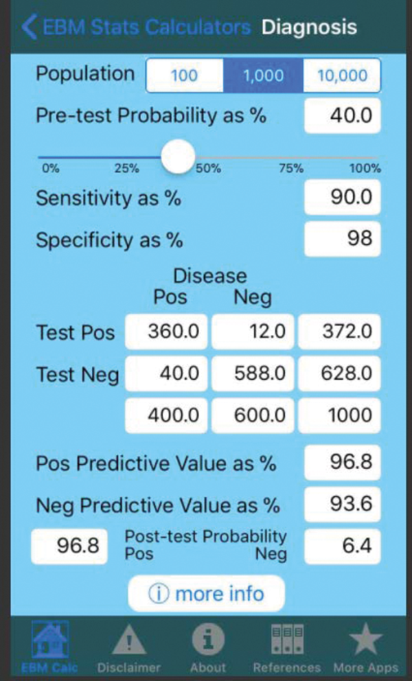 EBM Stats Calc was developed by Josh Steinberg, a physician who has developed a number of apps that make it possible to consult evidence-based resources at the point of care. In addition to its value as a resource for medical decision-making, Dr Steinberg has correctly pointed out the potential value of EBM Stats Calc as an educational resource. For example, educators can demonstrate the impact of pre-test probability on the overall usefulness of a test: students can use the slider tool to adjust the pre-test probability and then watch to see the impact of those adjustments on the calculated values. Users can also click on “more info” to access detailed information about the calculations available in each section of the app.