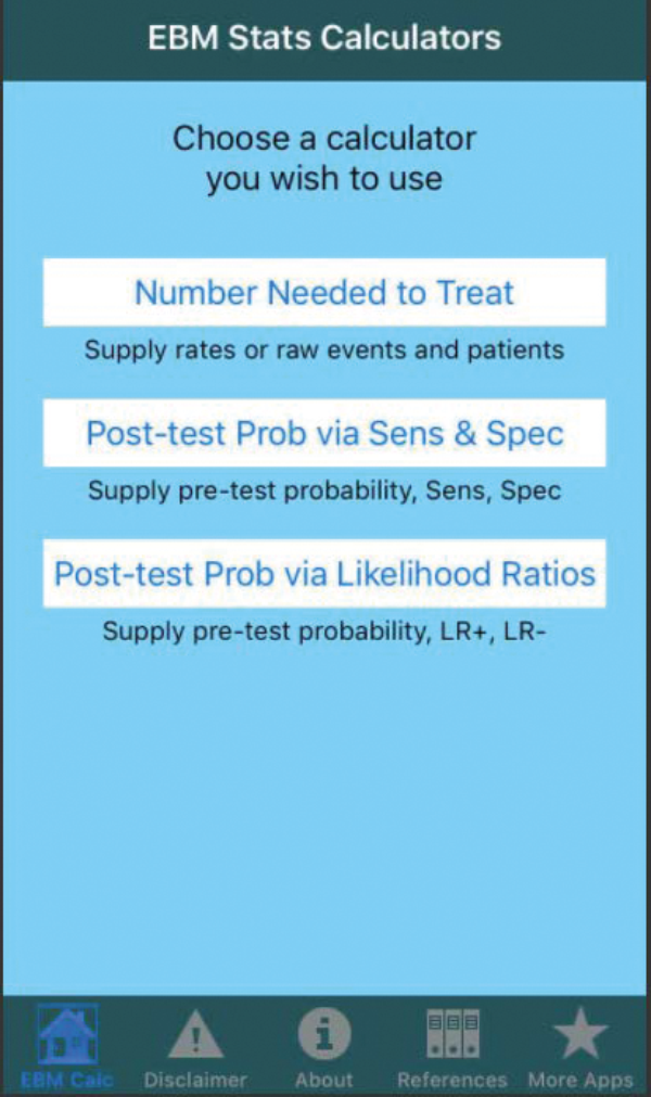 EBM Stats Calc is an app that aims to help physicians better quantify their decision-making processes. Clinicians can input likelihood ratios, sensitivity/specificity values, or raw data to calculate number needed to treat (NNT), post-test probability and positive/negative predictive value.