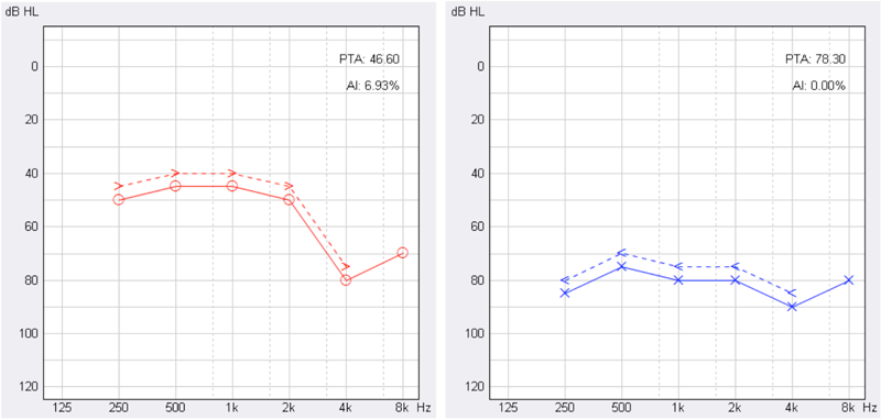 Since the auditory system is impaired by blast or acoustic trauma and the resorbtion of excitatory neurotransmitters is abnormal peripherally [12], the condition of hearing loss is not stable and depends on exposure to noise during daily life. Our data shows that exposure to noise over a short duration can cause more hearing loss, which is not reversible. For instance, in Figure 5, there is an audiogram for a veteran before and after exposure to music. When some veterans with blast trauma are exposed to loud noises during daily life, they experience some dizziness or vertigo. This suggests that there might also be some balance disorder due to blast trauma, which appears over time and with age, and is deteriorated by strong sound triggers.