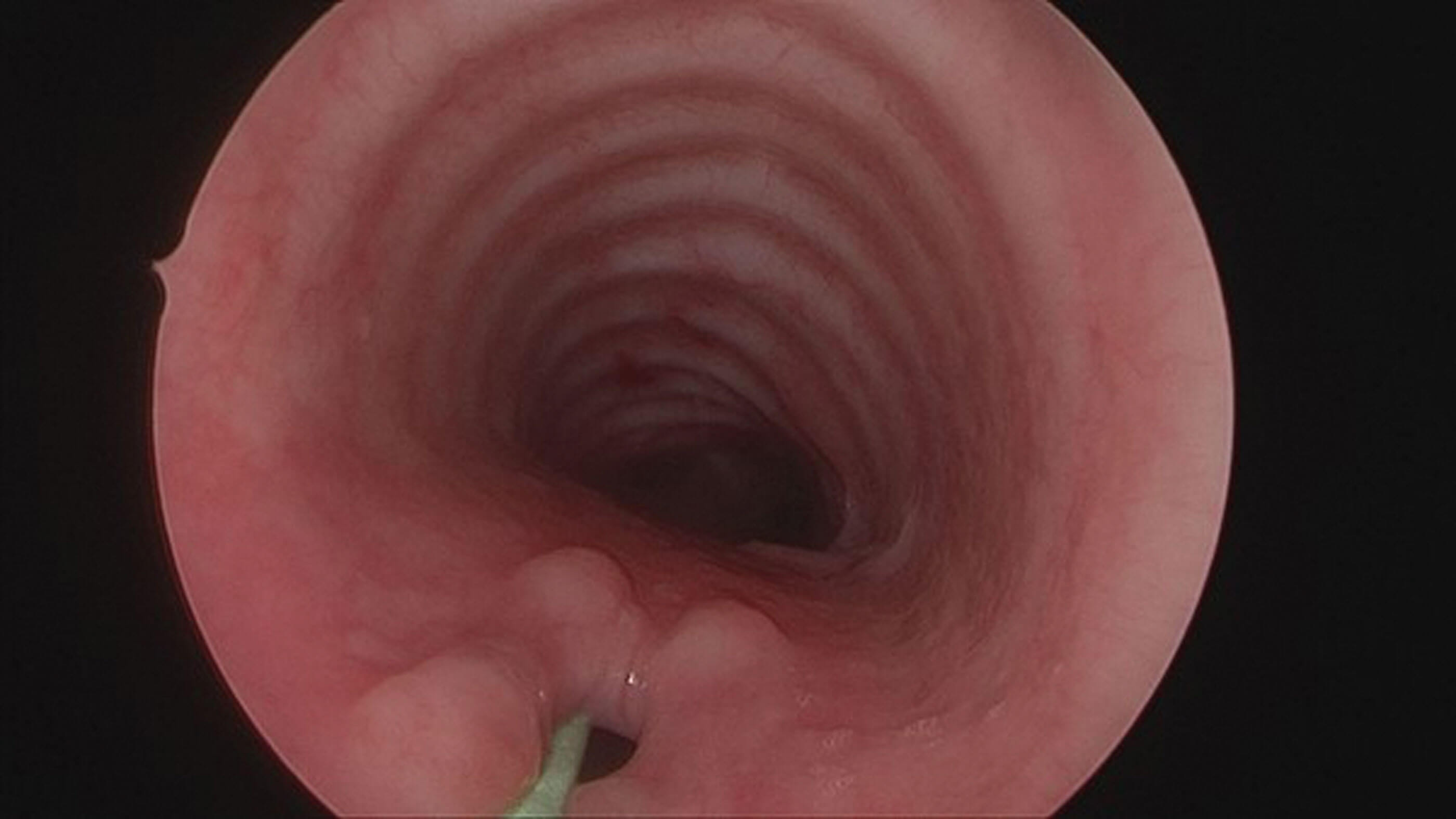 Figure 2. Endoscopic view of larynx showing recurrent respiratory papillomatosis.