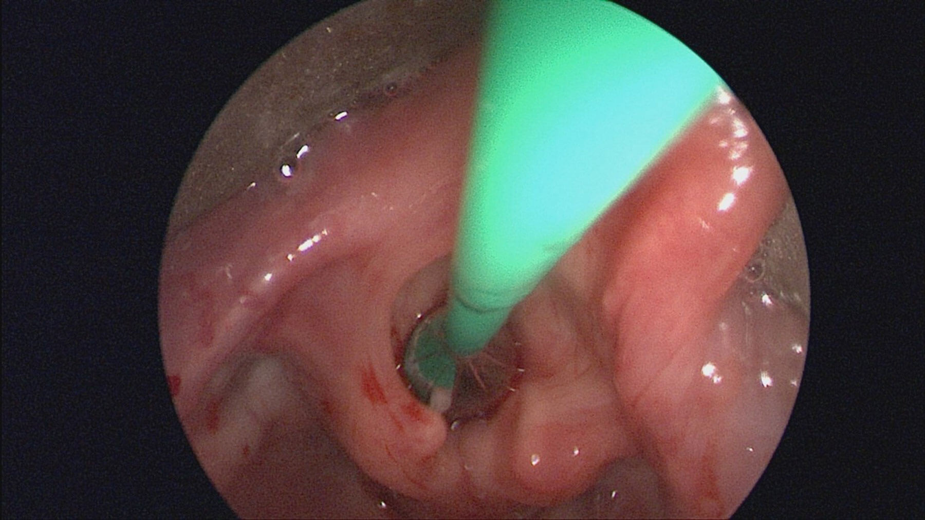 Recurrent fistula repair can be managed via an endoscopic approach and broadly involves de-epithelialisation of the tract. This can be carried out using a variety of techniques including diathermy, or cold steel with application of a tissue sealant such as fibrin glue. More recently, the application of trichloroacetic acid to the pouch has proved popular with excellent results. After ‘roughing up’ the mucosa of the tract using a brush or patty, trichloroacetic acid is applied to a small neuro-patty and applied directly to the pouch for roughly 30 seconds. Care is taken to ensure the acid does not come into contact with mucosa within the trachea. Between one to three treatments, approximately four to six weeks apart, are usually required to achieve adequate closure of the pouch.