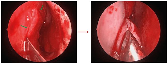Figure 3. Nasoseptal flap creation and elevation. Green arrows indicate incision sites.
