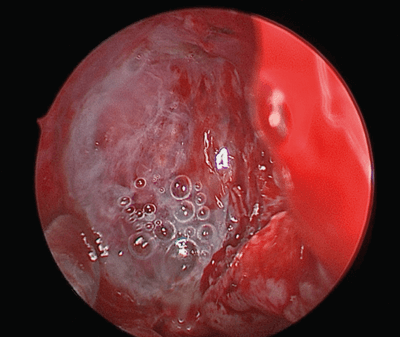 Once the common cavity has been created, any meningoencephalocele at the skull base defect is either excised or contracted using bipolar diathermy (see Figure 2). The surrounding mucosa at the defect is removed to freshen the edge by approximately 5mm, as previously described by Wormald.