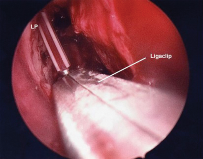 A wide nasolacrimal window is created. Silastic lacrimal stents are then placed via both upper and lower canaliculi, retrieved endonasally (Figures 7a & b) and tightened over a 18 gauge venflon sheath / silastic tubing (Figure 8) to prevent upward migration of the stent knot. The stent loop is ensured not to be too tight as it may cheese wire through the puncta. We prefer using ligaclips to stabilise the stents (Figures 9a & b) in place of knots to avoid any risk of slippage of the knot leading to stent laxity. The nasal mucosa is trimmed and folded back to cover the exposed bone and haemostasis achieved with suction diathermy.